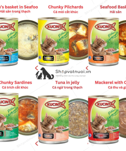 Cá Trích/ cá thu/ gà/ cá mòi/ cá cơm/ tôm, Chất Tạo Thạch (Cassia Gum, thống Hoa. Caragonan Và Guar Gum và Muối khoáng), Các Loại Vitamin (Choline Chloride, Vitamin A, B1 (Thiamine), Vitamin B2 (Riboflavin), Niacin, Pantothenic Acid, Vitamin B6 (Pyridoxine), Biotin, Folic Acid, Vitamin D3, E, K3) Và Khoáng Chất (Kem, Sát, Mangan, i Ốt, Selen), Guar Gum, Taurine. Màu Thực Phẩm Được Chấp Nhận (Canthaxanthin 10%)
