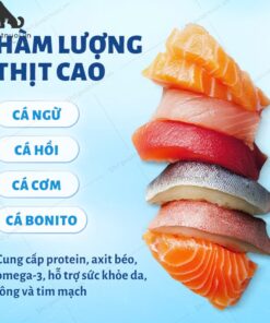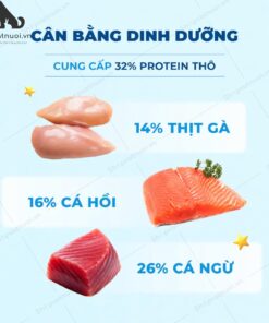 – Hàm lượng đạm chất lượng cao: 26% cá ngừ, 16%cá hồi, và 14% thịt gà, sản phẩm cung cấp nguồn protein động vật cao cấp giúp mèo phát triển cơ bắp và giữ năng lượng dồi dào.