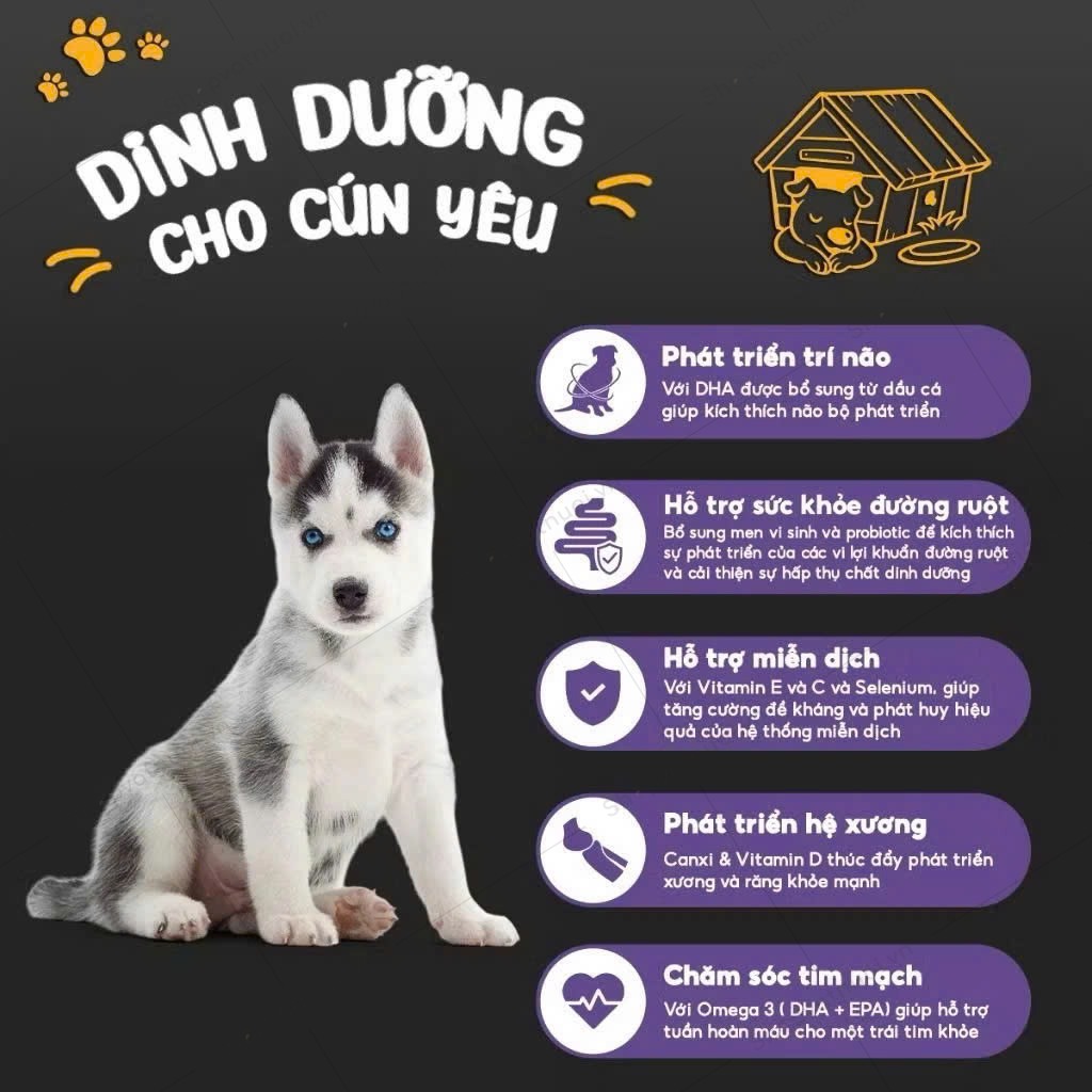 – Cung cấp năng lượng, Vitamin & khoáng, Omega 3&6 giúp cho da và bộ lông khỏe mạnh.
